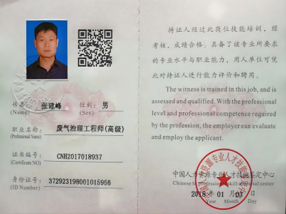 废气工程师证书